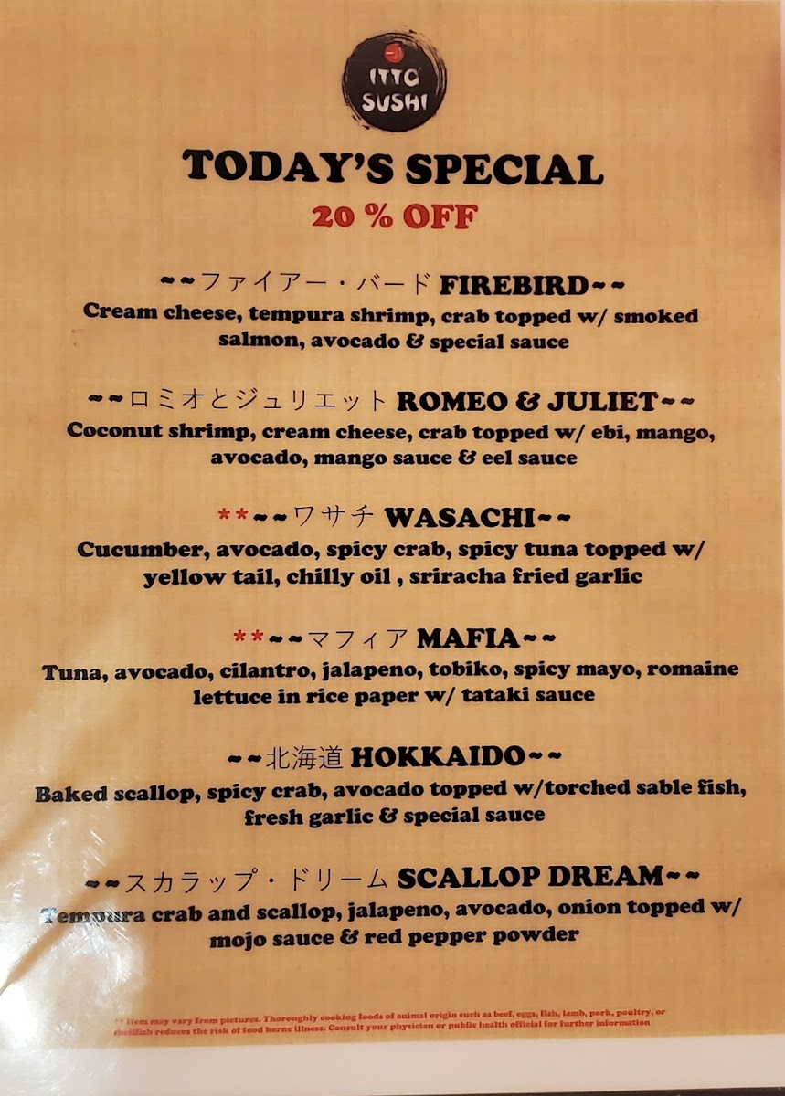 Welcome to Itto Sushi South Jordan, where the art of sushi meets innovative culinary flair. Located at 10555 S Redwood Rd, this charming eatery boasts an exciting menu that caters to all tastes. Dive into their beloved Bento Box Special, featuring assorted proteins from teriyaki classics to chef-selected nigiri, paired with crisp salad and gyoza. For ramen enthusiasts, the Tonkotsu and Miso Ramen offer rich, flavorful broths that warm the soul.